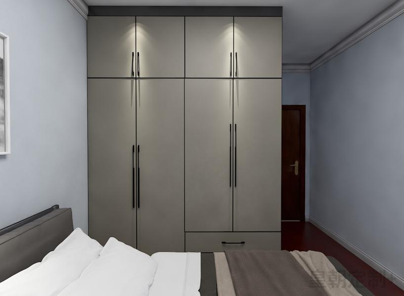 2、骑士灰大床搭配条形灰色科技布软包床头屏,尽显现代简约风范。