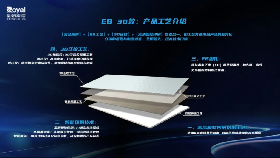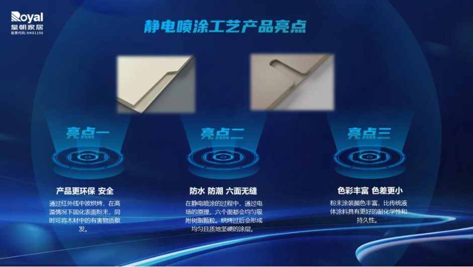 会上,皇朝家居重磅推出电子束固化和静电喷粉涂装工艺。电子束固化是一种革命性的涂料固化工艺,固化效率高、效果好,经其精制而成的高端板材,兼具高颜值、硬度高、更环保、易清洁等核心优势,可应用范围更为广泛;静电喷粉涂装工艺利用静电吸附进行固态喷涂,板材六面着色均匀,实现零甲醛、零VOC释放,达到防潮、防霉、防污的效果,为消费者带来超预期的品质和体验。